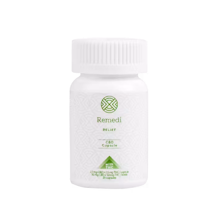 100mg CBD/100mg THC 20pk Description Remedi Relief delivers a formulation that works with your body, so that you can get back to what matters most. Handpicked cannabis. Easy to dose. Capsules can be long lasting. Individual results may vary. 12.5g (0.44 oz) 2.5 mg CBD + 2.5 mg THC / capsule 50 mg CBD + 50 mg THC / bottle 20 capsules / bottle