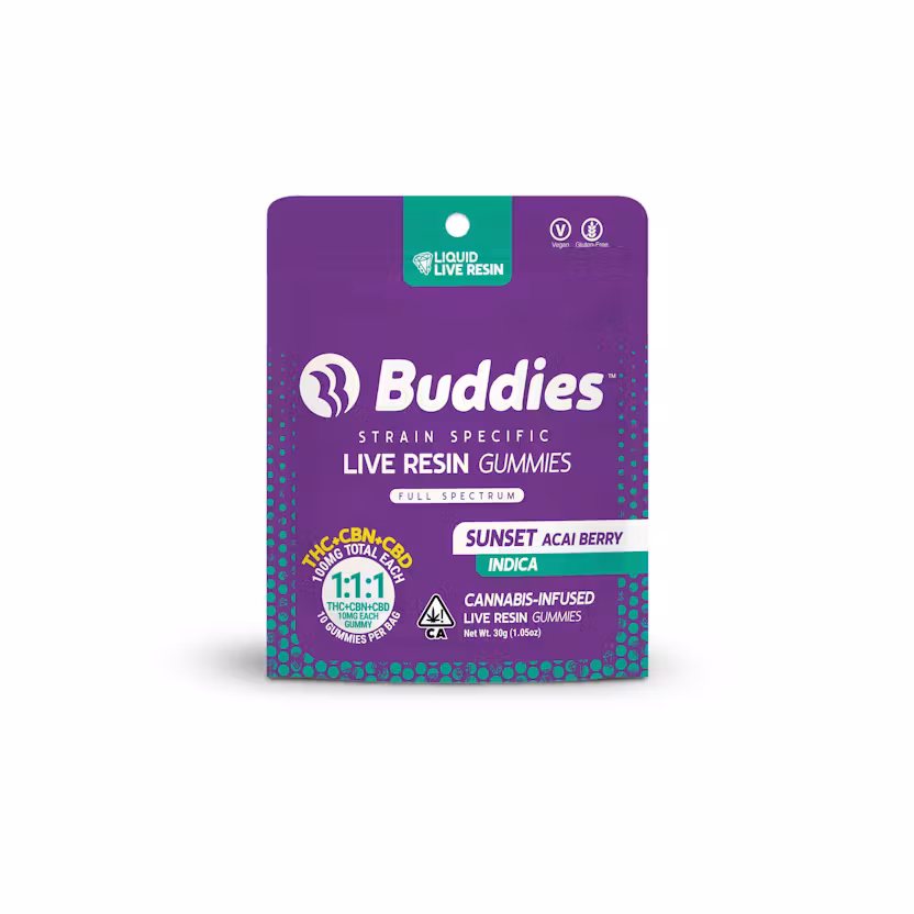 Buddies Liquid Live Resin+ Gummies offer a delicious way to enjoy our indica strain-specific Live Resin blended with CBN & CBD for increased effects and benefits. Expertly formulated with a 1:1:1 ratio of THC to CBN to CBD, our gummies are tailored to provide precisely dosed support to end your day. Ready to rest? Savor the soothing taste of Açai Berry while enjoying sustained relief and relaxation.